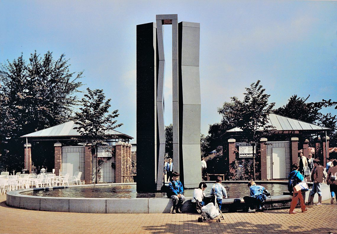 Christian Megert, Brunnen mit 3 Stelen, Bundesgartenschau 1987, ø 1200 cm, Stelen je 70 x 70 x 700 cm