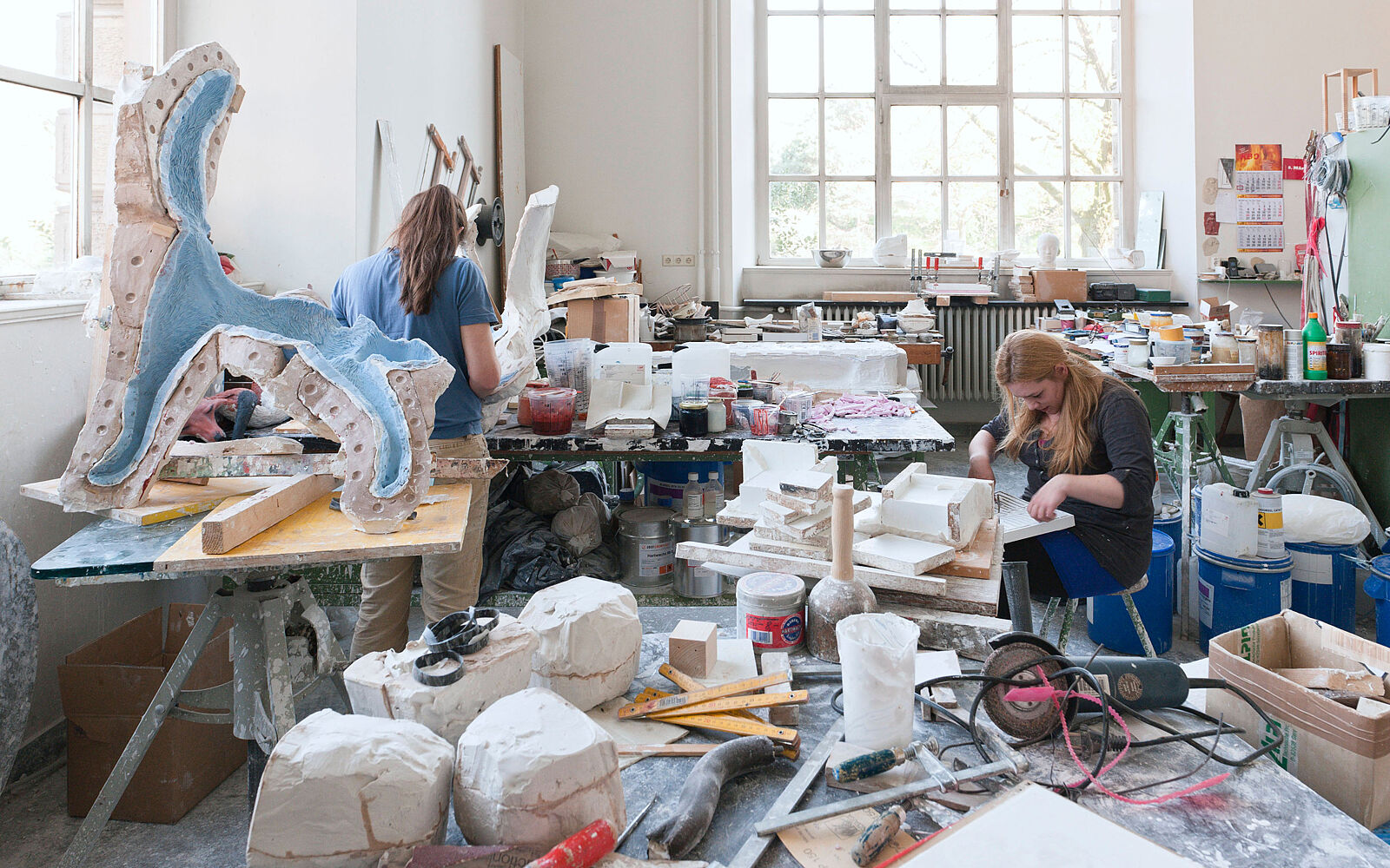 The Plaster workshop at the Kunstakademie Düsseldorf offers students the opportunity to realize their own ideas primarily using the plastic materials plaster, clay, wax, concrete, and silicone. The necessary artistic strategies and working processes, such as the procedures for model or original production, mold construction, and casting, are conveyed alongside the practice.